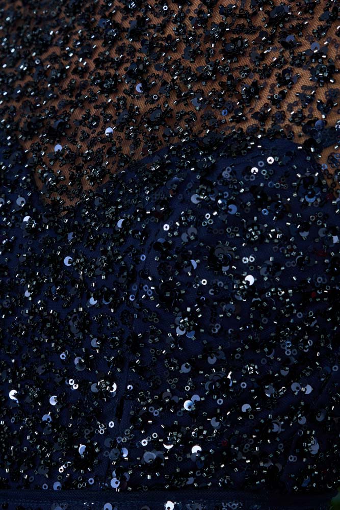 O tule bordado traz delicadeza e textura ao vestido valorizando a silhueta com transparência sutil e acabamento refinado.