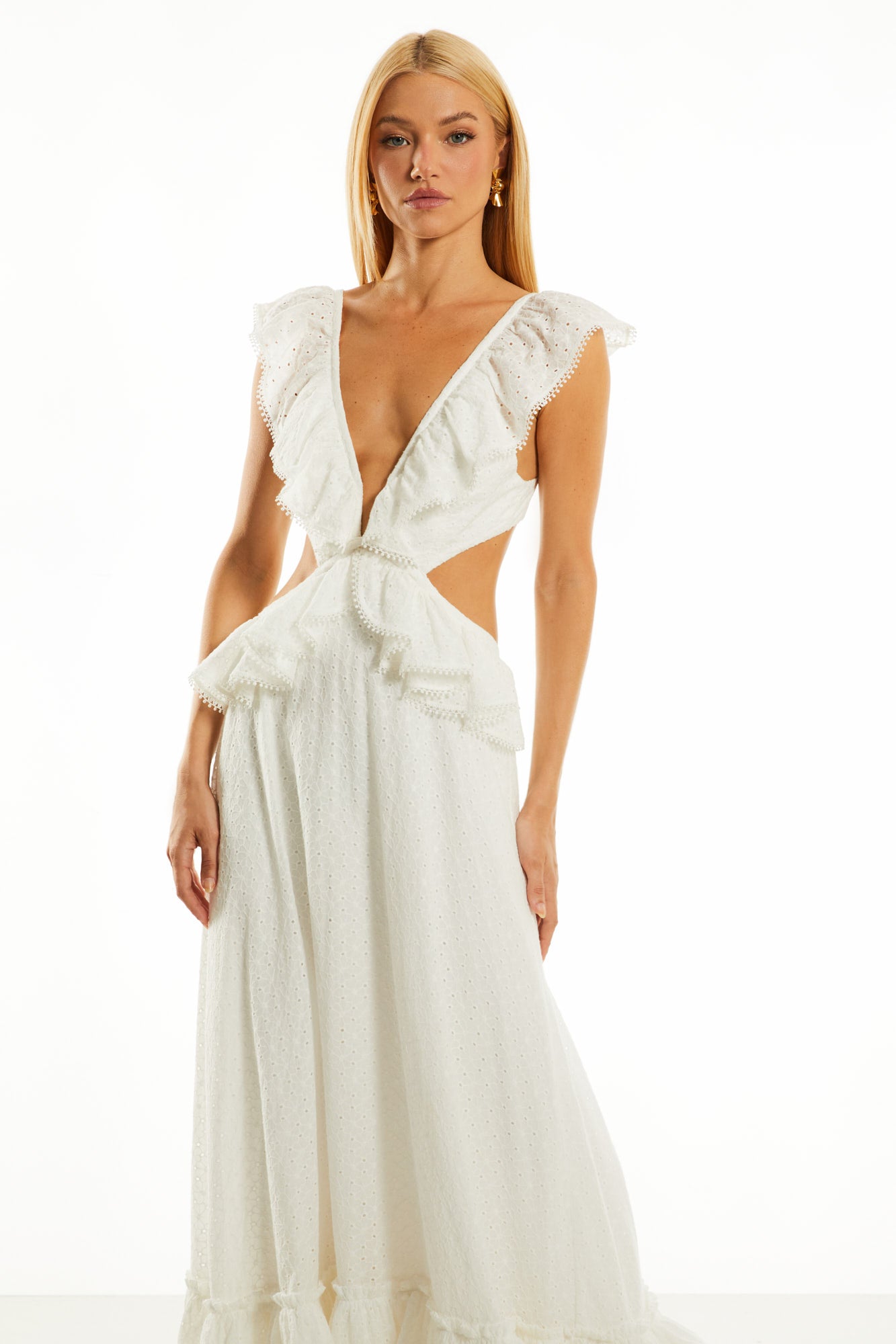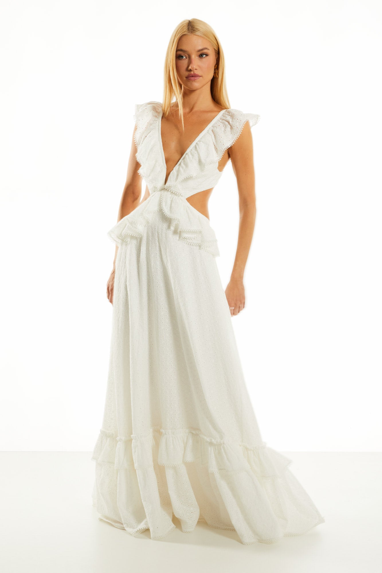 O vestido longo off white confeccionado em laise é uma peça que irradia elegância e refinamento, perfeita para diversas ocasiões que exigem um toque de classe.