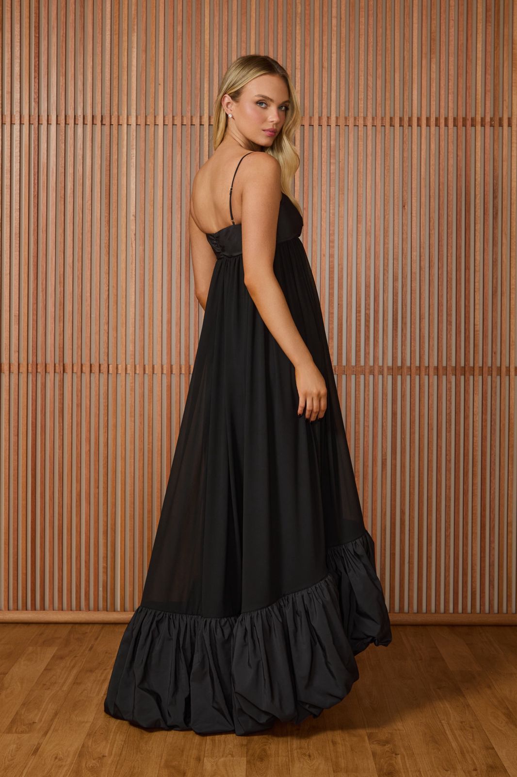 Vestido longo preto confeccionado em tecido leve combinado com tricoline. Possui alças finas com reguladores, decote v, recorte abaixo do busto e saia mullet com recorte na barra. Fechamento posterior por zíper.