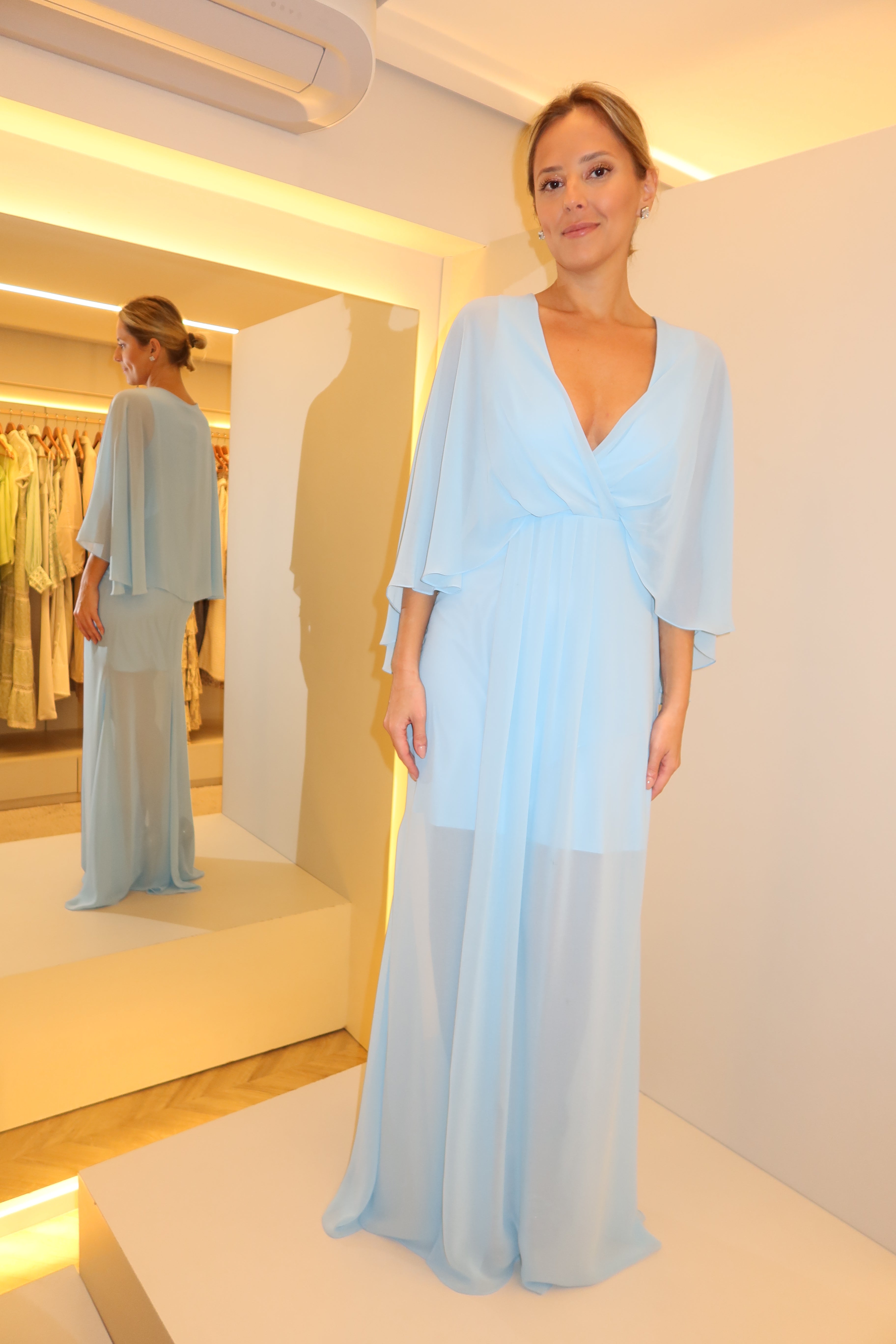 Encante com este vestido longo azul bebê, feito em tecido leve e levemente transparente, com forro em viscose que garante conforto e cobertura. As mangas de comprimento médio, que se estendem como uma capa elegante nas costas, criam movimento e um efeito dramático sofisticado. Ideal para festas, casamentos ou eventos especiais, é a escolha perfeita para quem quer unir leveza, cor e glamour em um só look.