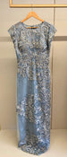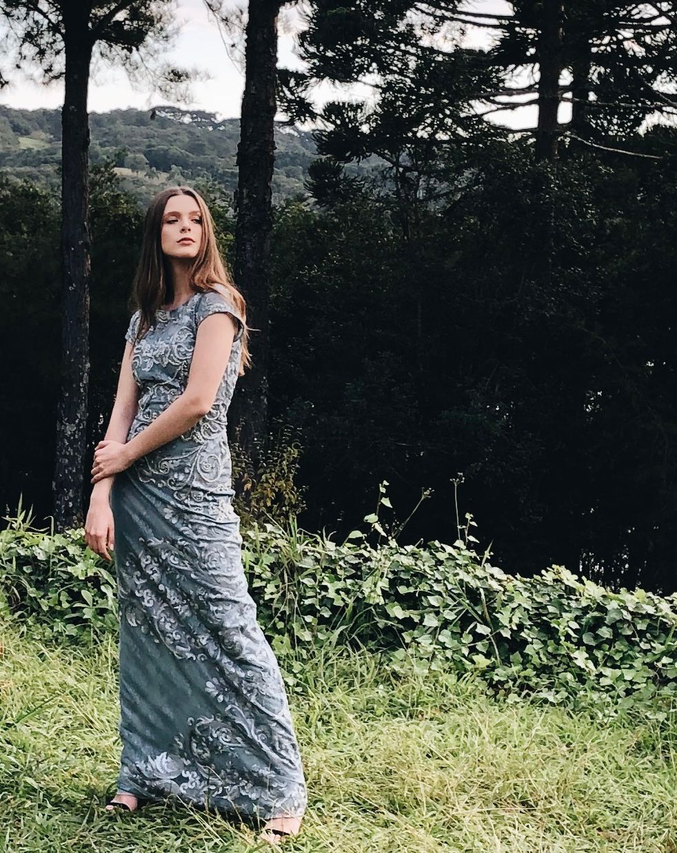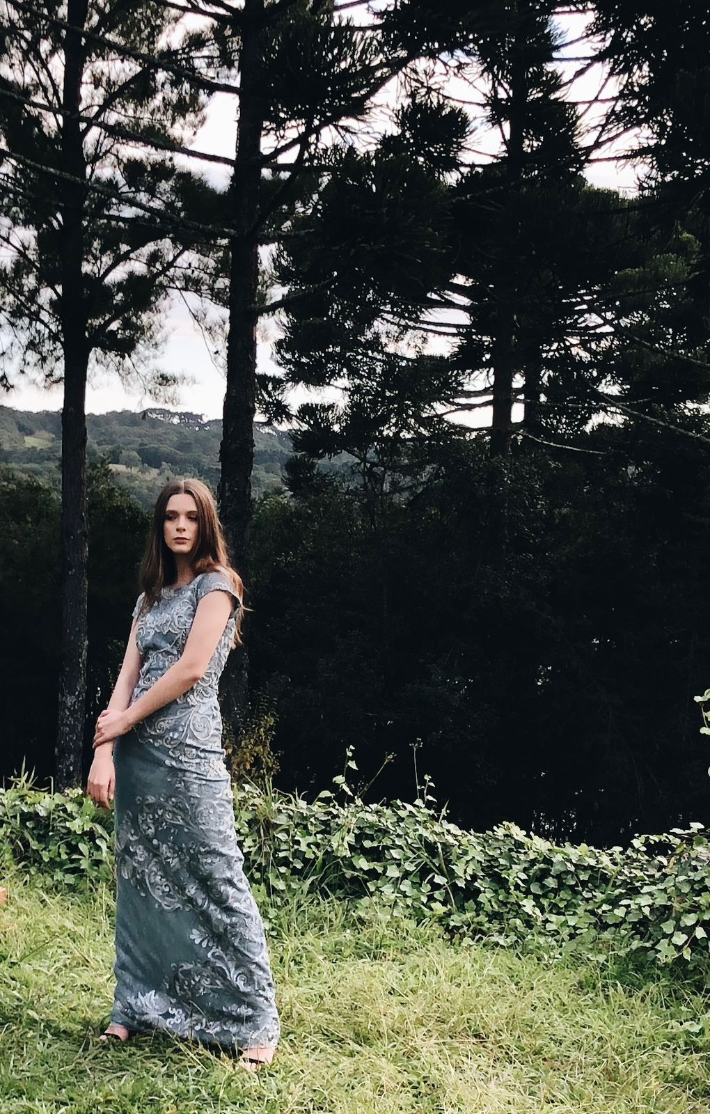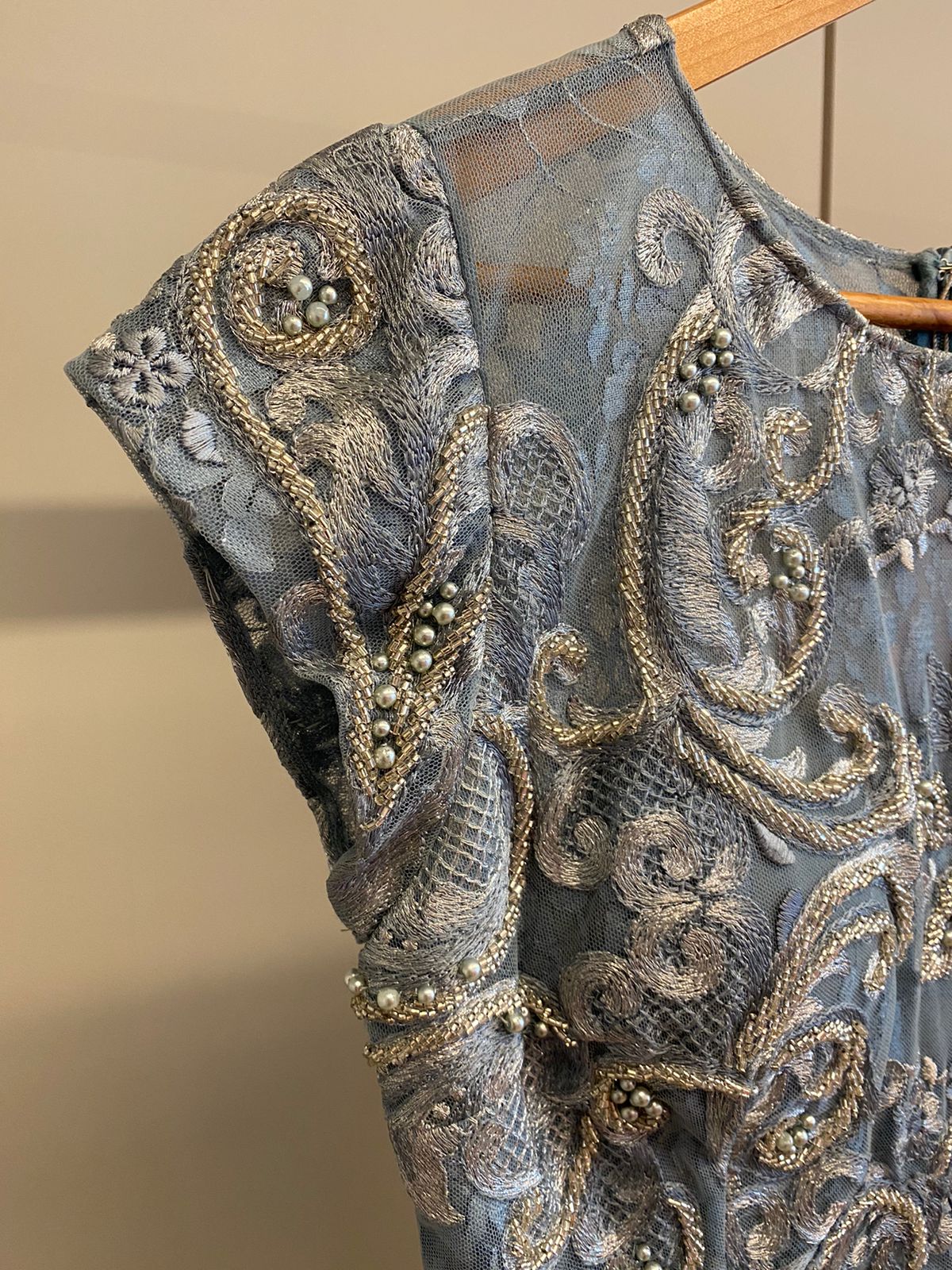 Vestido Patrícia Boanldi, bordado e com aplicação de pedrarias. O vestido possui um tule bordado fazendo o contorno do decote na parte superior da peça. Este delicado tule se sobrepõe ao forro na cor azul, que é todo bordado fazendo um tom sobre tom no modo que foi confeccionado. Fechamento por zíper invisível na parte posterior do vestido. Possui discreto bojo para sustentação.