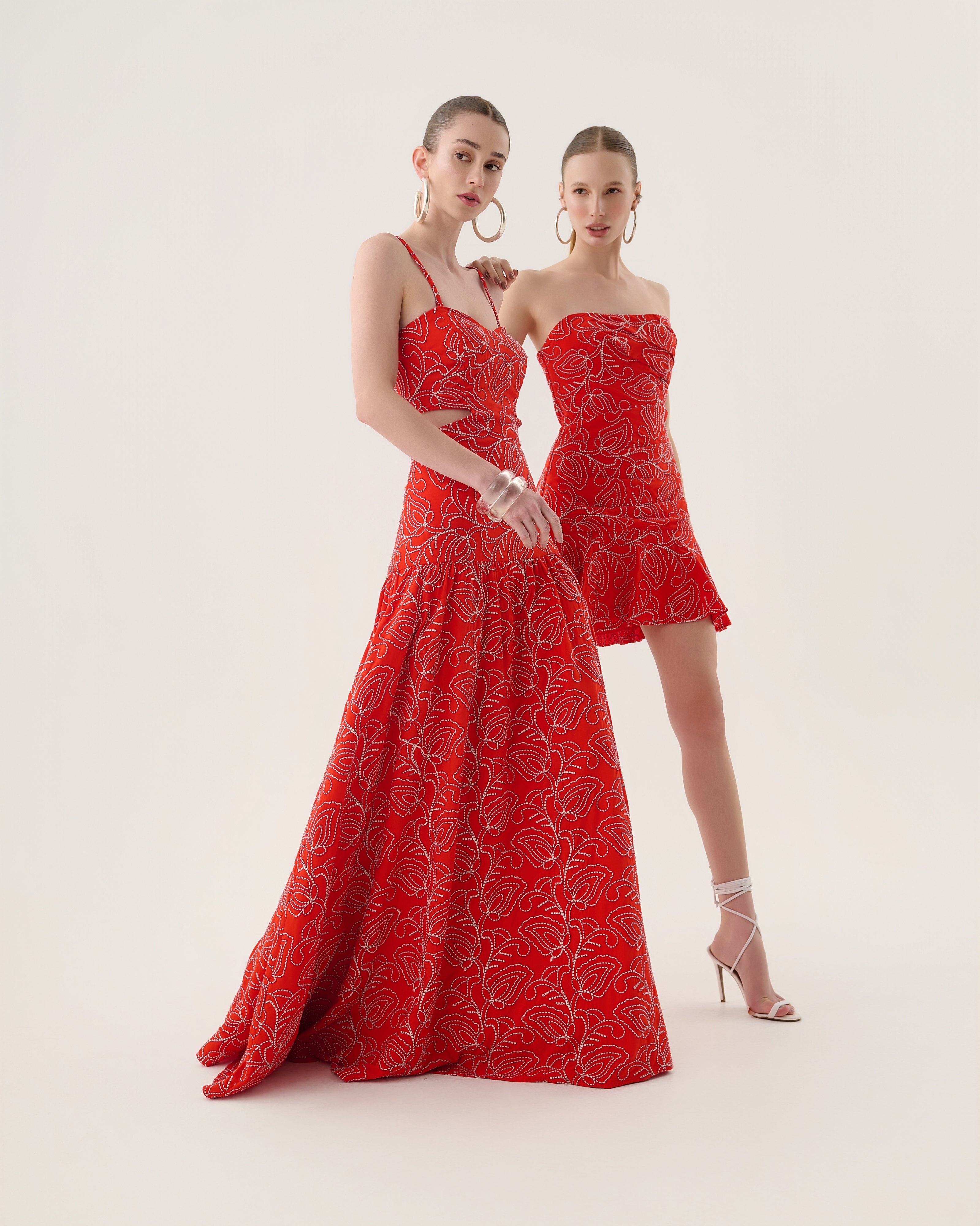 O vestido longo na cor vermelha une leveza e sofisticação em uma proposta atemporal. Os recortes na cintura criam um efeito delicado e moderno, enquanto o bordado minucioso valoriza a peça com elegância artesanal. A tonalidade clara destaca a suavidade do tecido e transmite frescor, ideal para eventos ao ar livre ou celebrações diurnas. A saia fluida garante movimento gracioso, enquanto o busto estruturado proporciona segurança e caimento impecável. Combine com joias discretas e sandálias em tons neutros para um visual refinado e versátil.