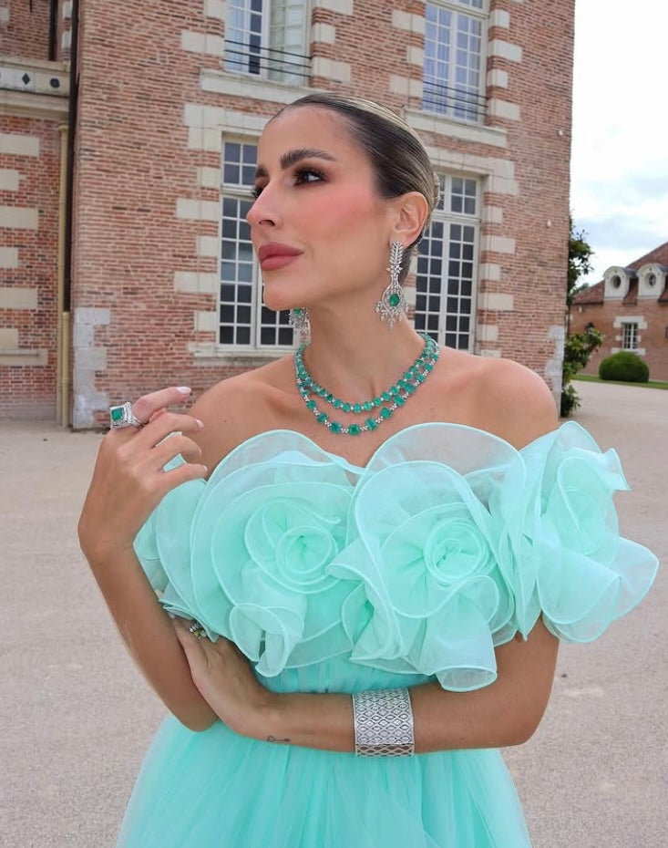 Com uma saia franzida de amplo volume, este vestido cria um efeito visual deslumbrante, destacando-se pelo movimento fluido e sofisticado. Esse detalhe é perfeito para quem deseja uma presença impactante e charmosa, combinando com eventos formais e festas glamorosas. A saia volumosa confere ao look um ar de realeza e destaque.