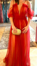 Vestido em camadas compostas, por forro e tule. Forro na cor bege e tule na cor vermelha. uma elegante combinação, entre cores e tecidos. Meias mangas bufantes. Comprimento longo.