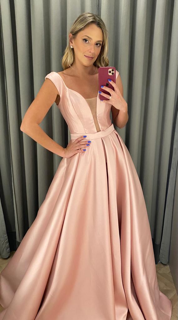 Vestido longo, em zibeline, na cor rosa em tom pastel. O vestido possui saia ampla, com camadas de tecido. Bojo estruturado. Decote com detalhe em tule. Possui alças largas.