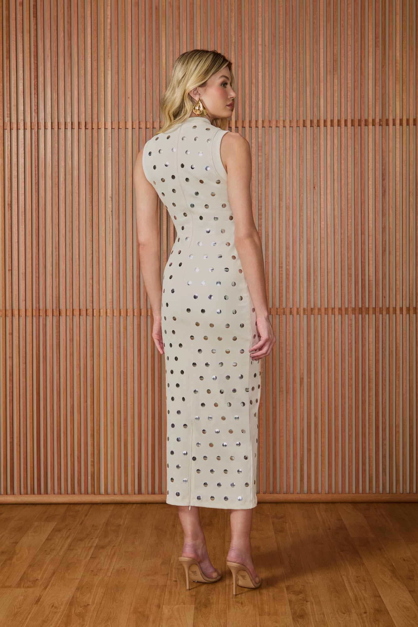 Vestido de comprimento midi confeccionado em malha com aplicações de metais em hotfix. Possui shape justo ao corpo, gola alta, sem mangas e fechamento posterior por zíper.