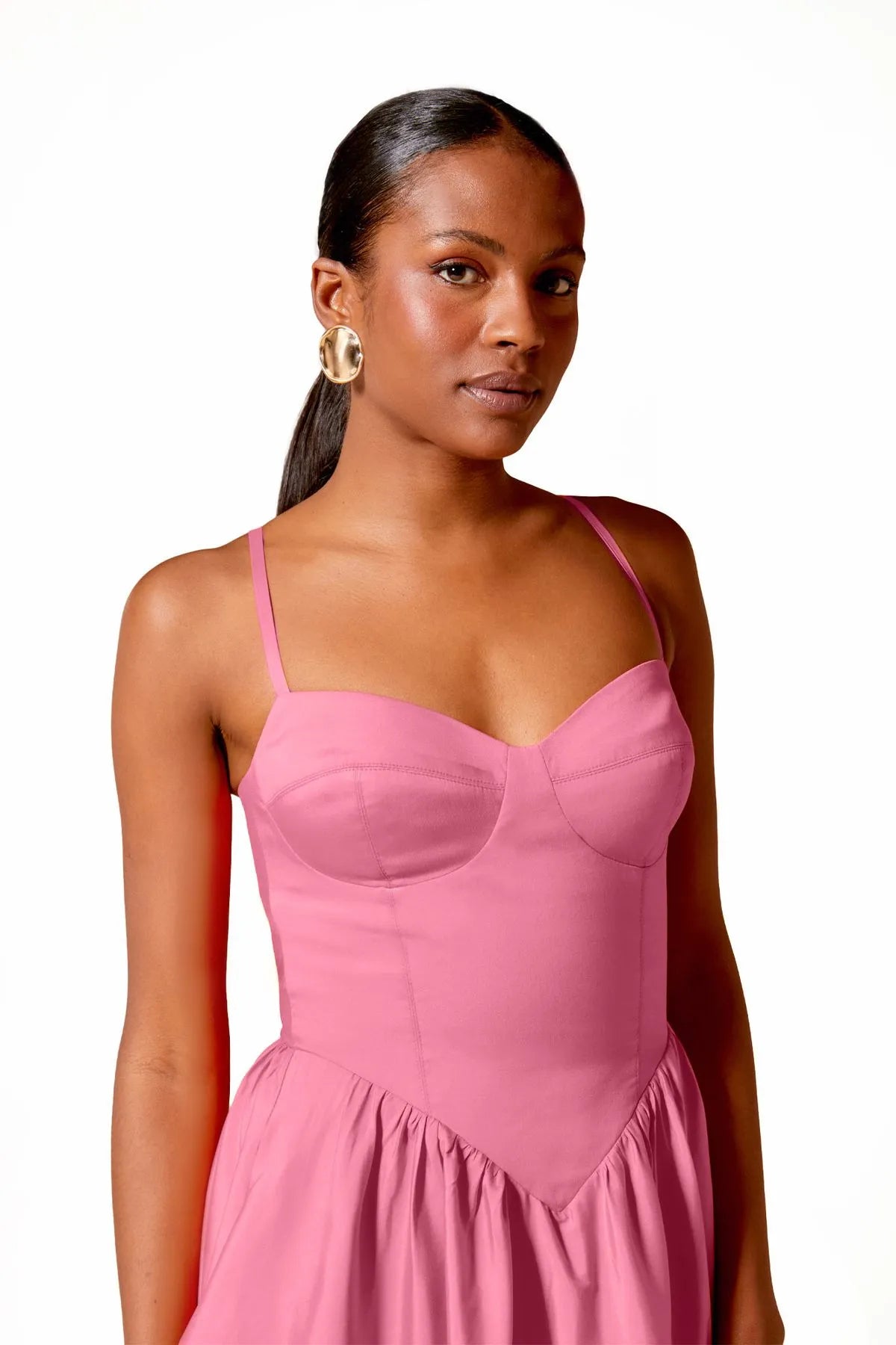 O vestido apresenta um decote coração, que valoriza o colo de maneira delicada e elegante. As alças finas com reguladores permitem um ajuste personalizado, proporcionando conforto e segurança.