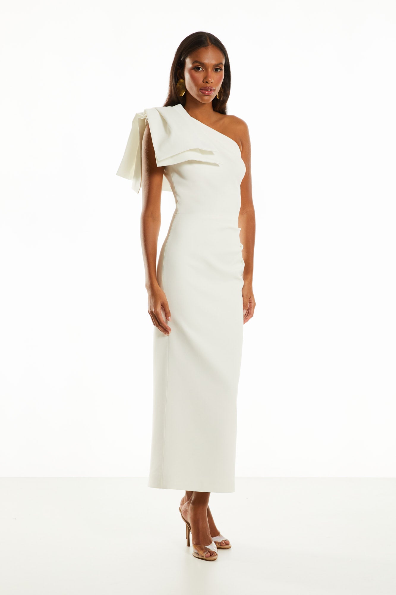 Vestido midi off white acinturado, confeccionado em tecido de crepe estruturado. Possui modelagem um ombro só, com faixa projetando um laço como detalhe acima do ombro e fechamento por zíper.