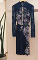 Vestido midi bordado, com aplicação de pedraria e brilhos. O vestido possui bojo interno para sustentação. As mangas longas fazem parte do tecido rendado, com transparência. Na parte posterior o fechamento se dá por meio de botões na gola e por zíper invisível no centro costas. O recorte que deixa as costas à mostra dá um tom descontraído e exibe muita feminilidade.