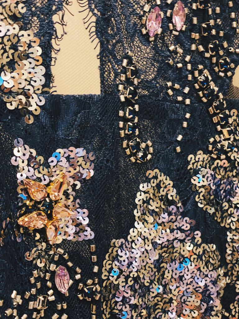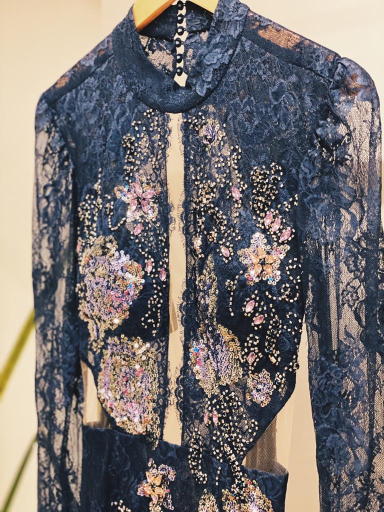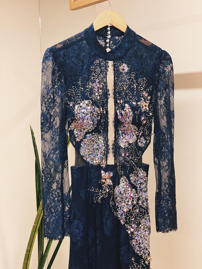 Vestido midi bordado, com aplicação de pedraria e brilhos. O vestido possui bojo interno para sustentação. As mangas longas fazem parte do tecido rendado, com transparência. Na parte posterior o fechamento se dá por meio de botões na gola e por zíper invisível no centro costas. O recorte que deixa as costas à mostra dá um tom descontraído e exibe muita feminilidade.